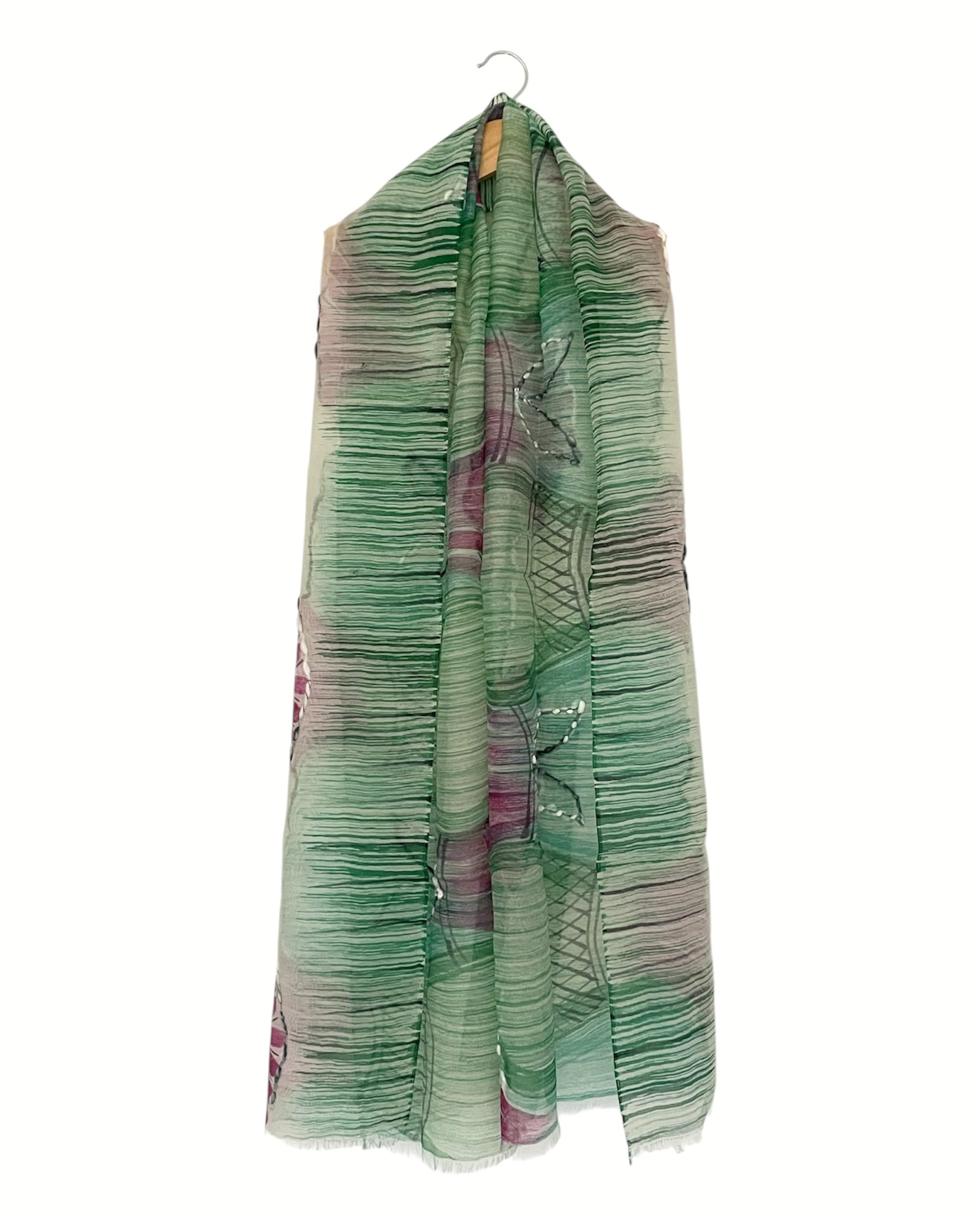 The base material used is a soft translucent fabric which is a blend of fine marino wool and silk making it a warm yet lightweight scarf.