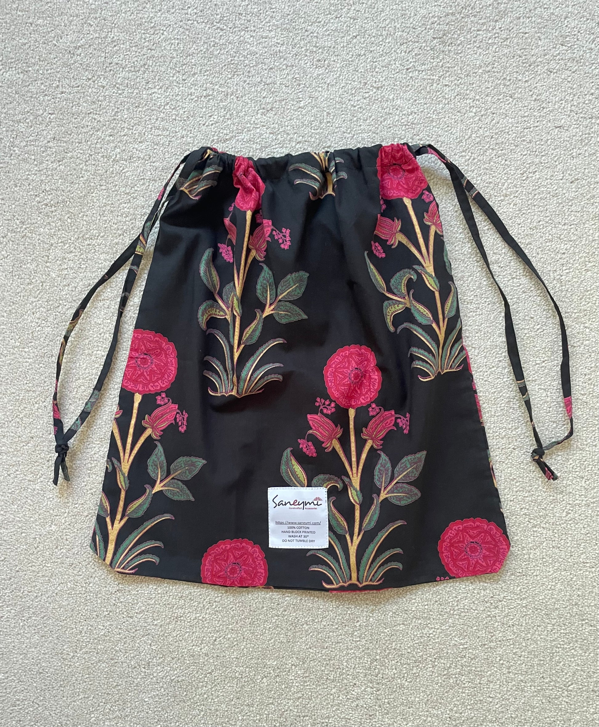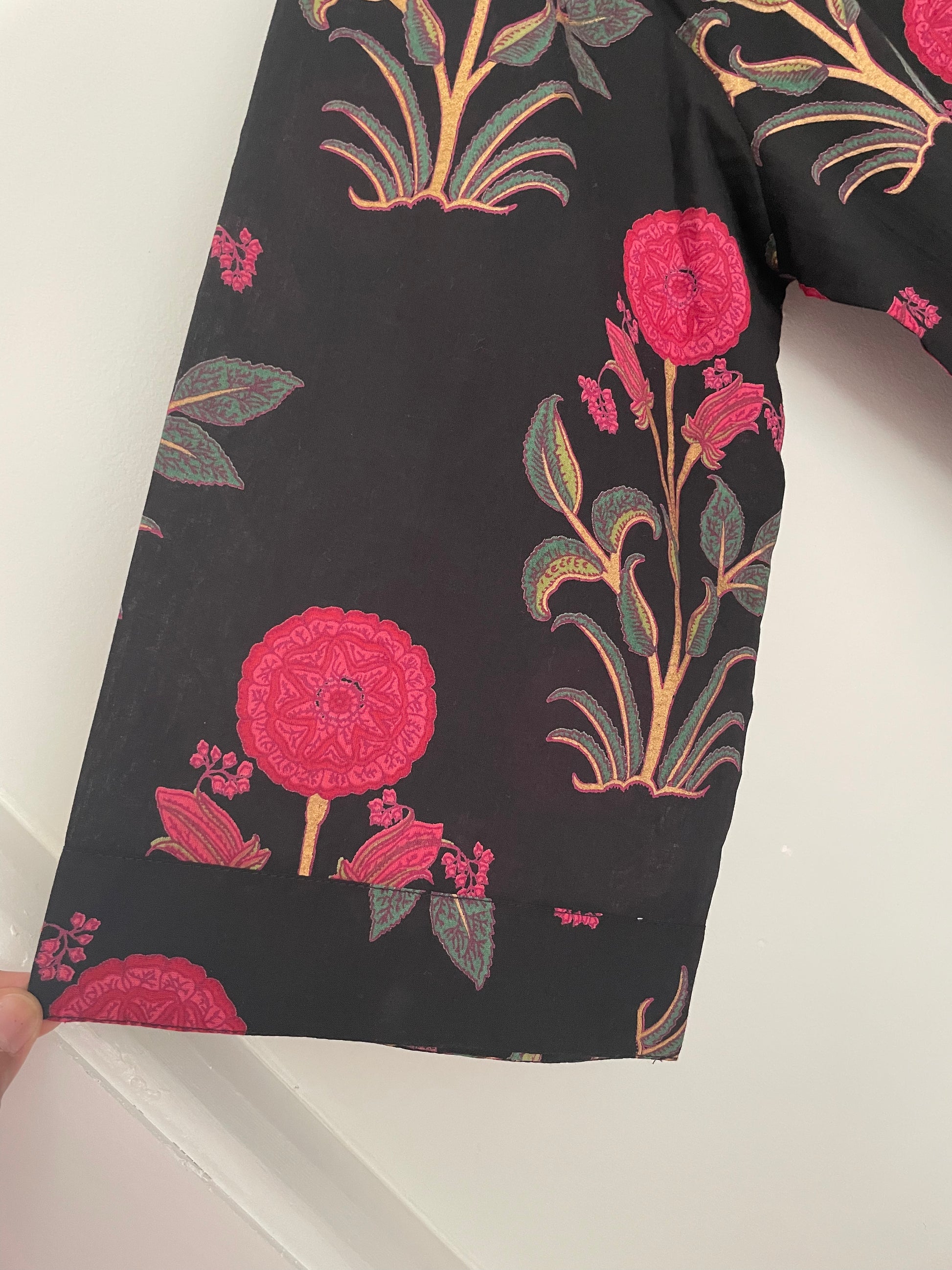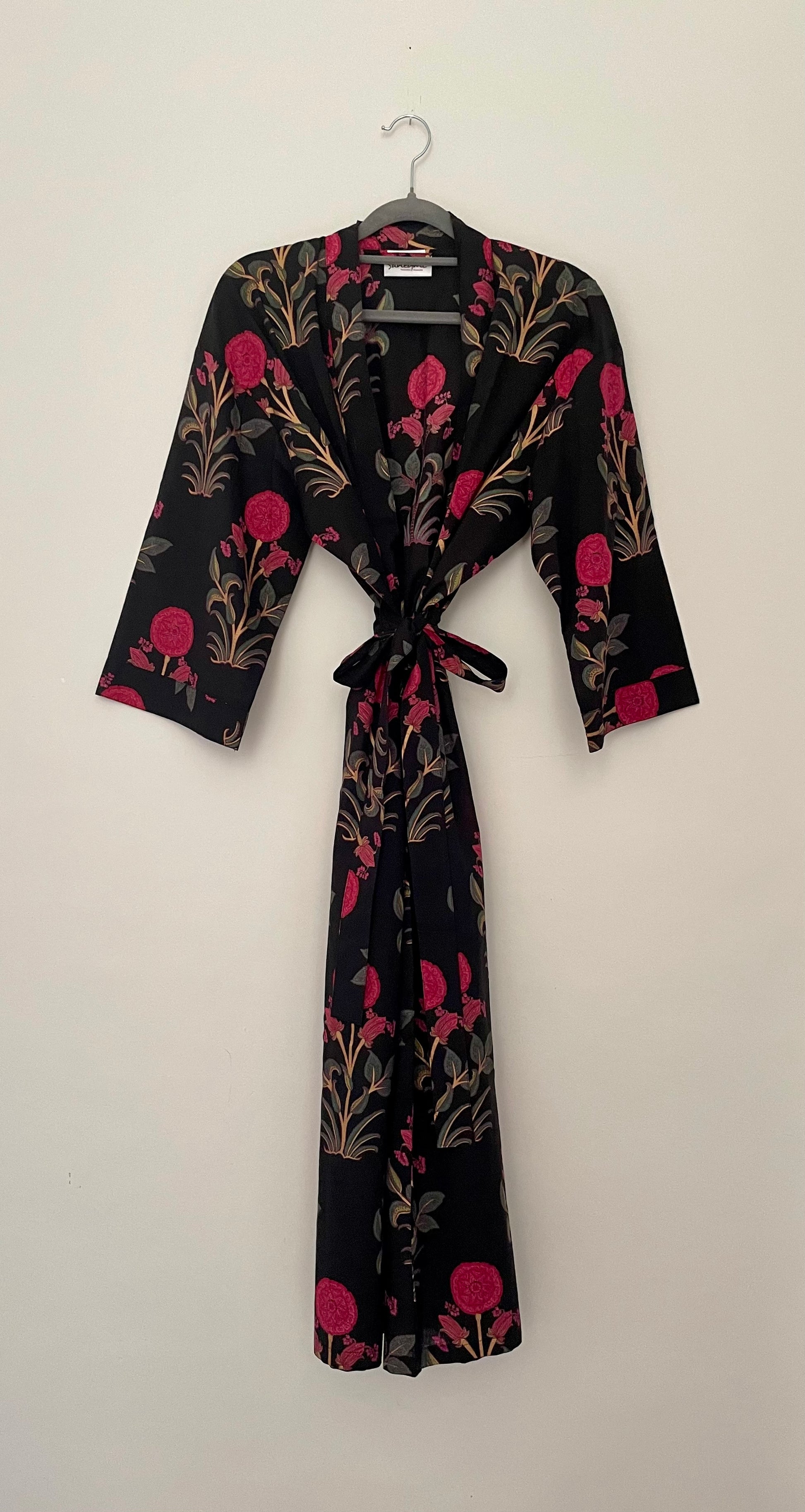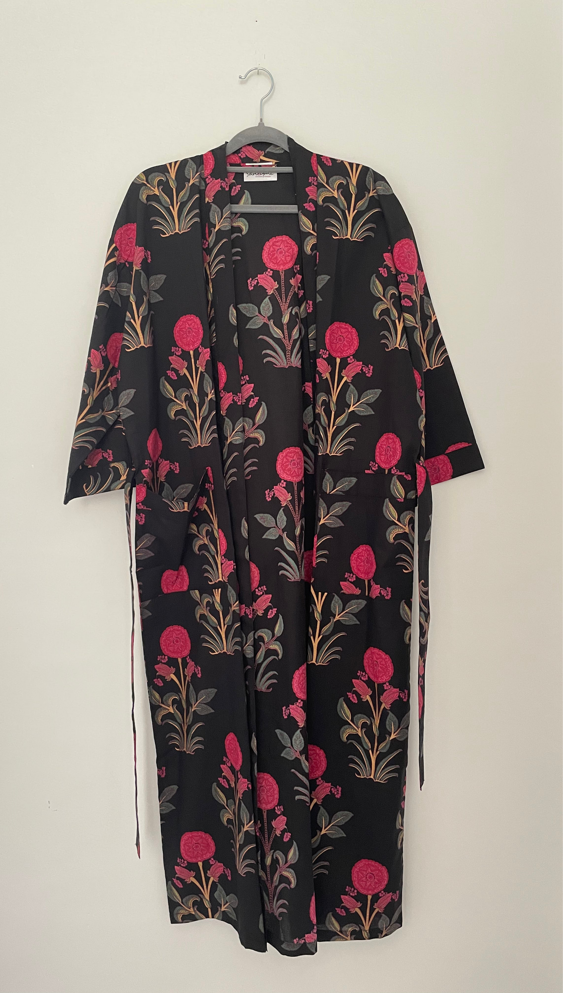 This beautiful dressing gown is made of a lightweight cotton fabric which is handprinted with wooden blocks in vibrant repeating floral motifs on a solid colour base.