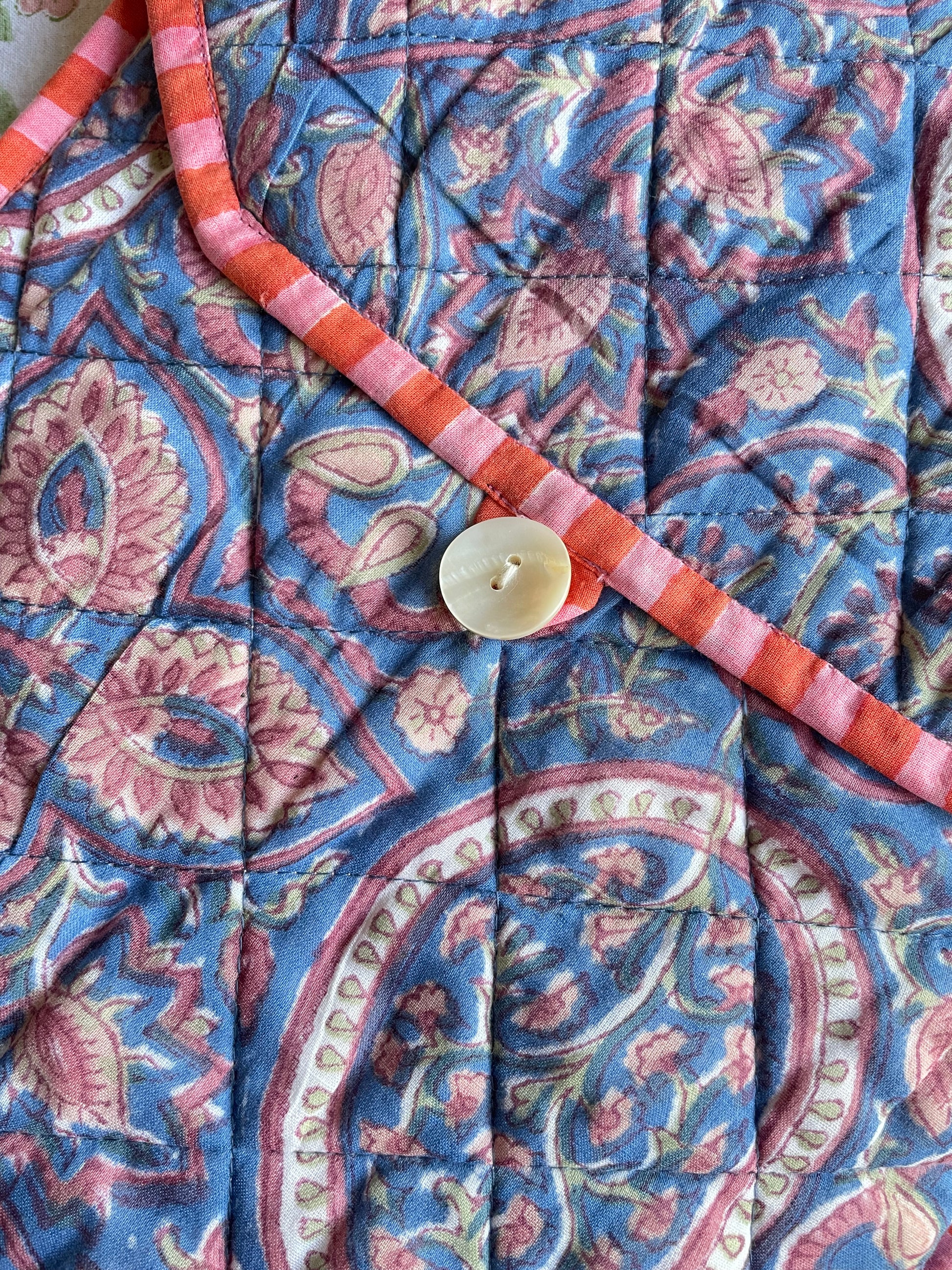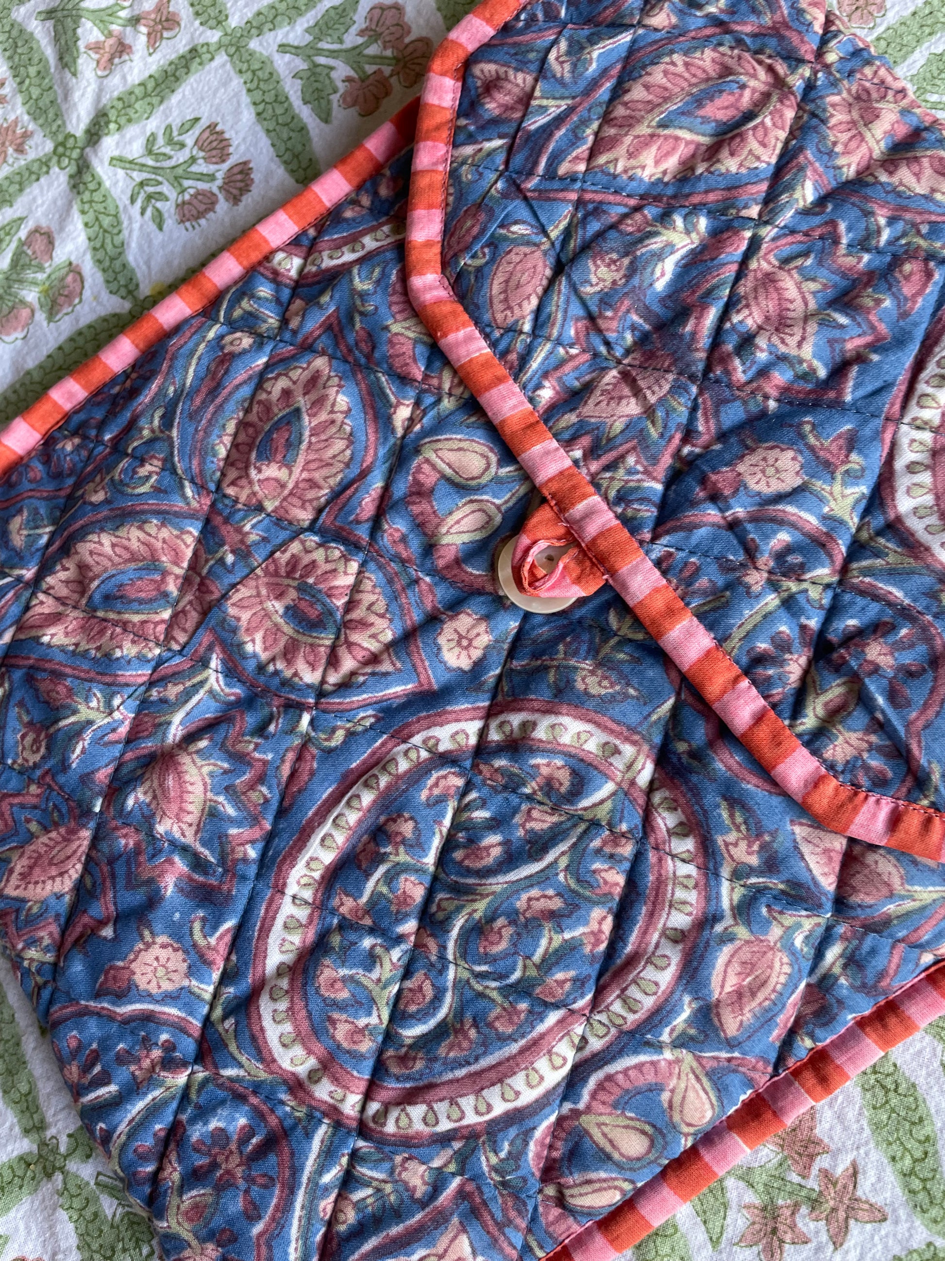 Hand block printed cotton fabric in overall floral design on the outside with contrasting candy stripe pattern on the inside and the piping.
